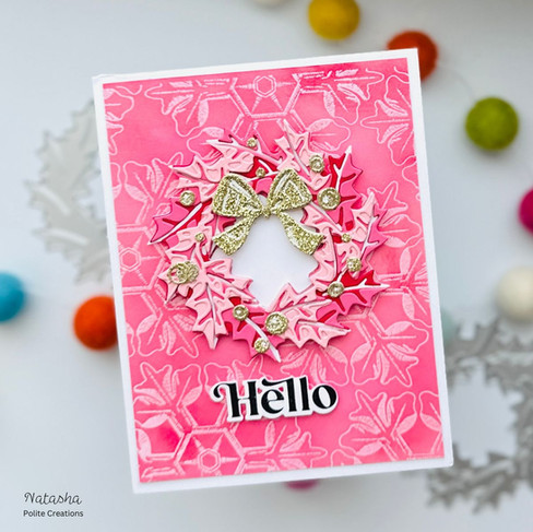 I wanted to utilize the Yuletide Wreath that is a colorize die from Sizzix + Tim Holtz. I also had a beautiful snowflake cling stamp from Simon Says Stamp that has gone unused for far too long. I decided to heat emboss one of the backgrounds onto pink cardstock and add some color variation using oxide inks. For the other, I simply stamped the image using the picked raspberry oxide ink.